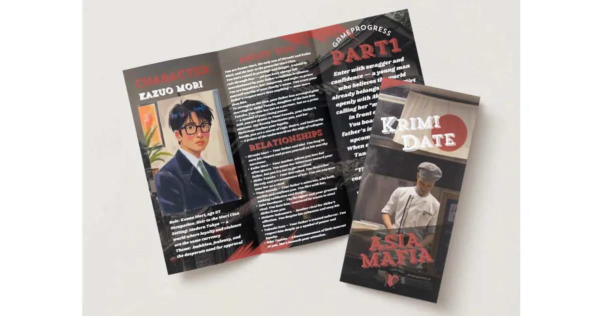 Ein interaktives Krimispiel rund um Macht, Intrigen und Geheimnisse im modernen Tokio. 18 Personen übernehmen Rollen innerhalb der Yakuza-Welt, einer Ermittlungsgruppe und politischen Figuren. Die Handlung entfaltet sich über drei Kapitel voller Spannung, Wendungen und einem zentralen Mordfall.